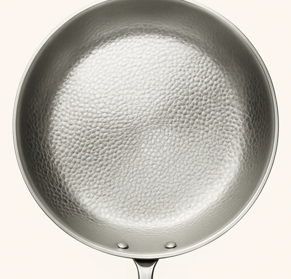 Het gehamerde oppervlak vermindert het contact met voedsel, waardoor aanbakken wordt voorkomen en schoonmaken moeiteloos gaat. Restjes veeg je eenvoudig weg, zelfs na koken op hoge temperatuur.