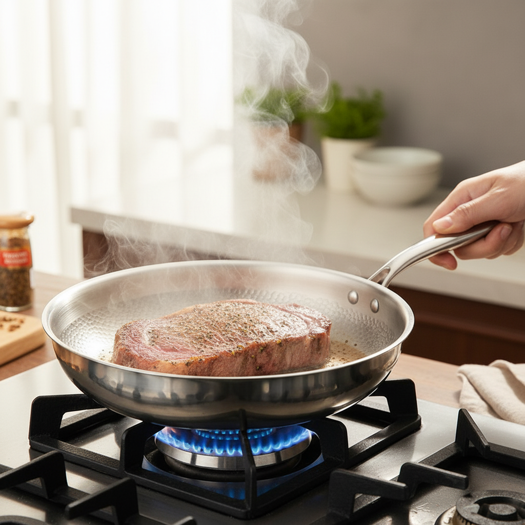 roestvrij staal (voor inductie), aluminium (voor snelle warmte) en een titanium-versterkt oppervlak (voor duurzaamheid).